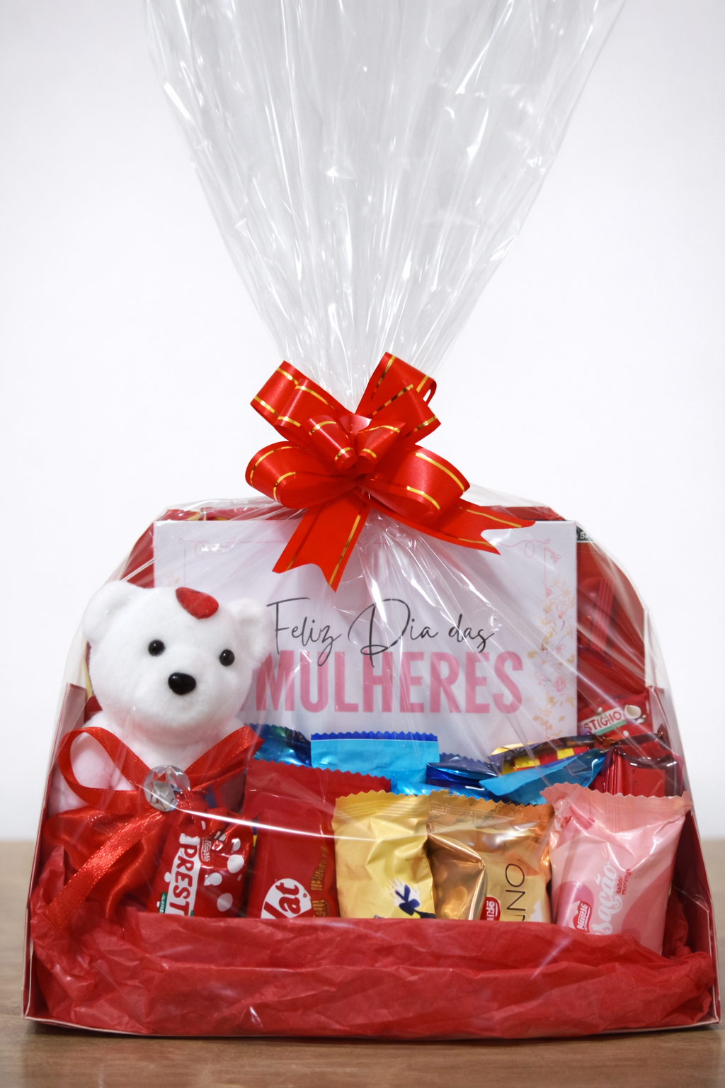 A cesta inclui uma deliciosa variedade de chocolates, cada um escolhido para proporcionar o máximo de sabor e sofisticação. Além disso, um ursinho decorativo complementa o visual, transmitindo toda a ternura e cuidado que o presente simboliza. Tudo embalado em papel transparente com um laço elegante, garantindo que a pessoa especial se encante logo ao primeiro olhar.