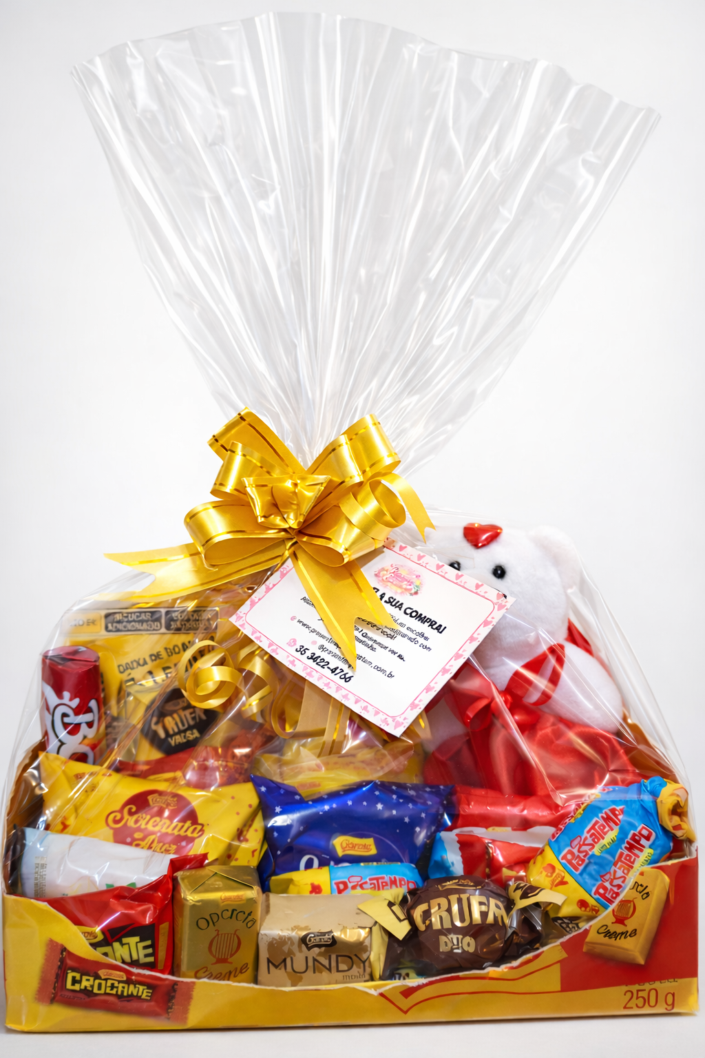 Composta por uma seleção de chocolates variados e acompanhada por um ursinho decorativo, esta cesta é cuidadosamente montada e embalada. O papel transparente e o sofisticado laço garantem uma apresentação impecável, pronta para encantar desde o primeiro olhar.